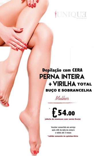 Depilação com Cera -Perna inteira + Virilha total + Buço + Sobrancelha